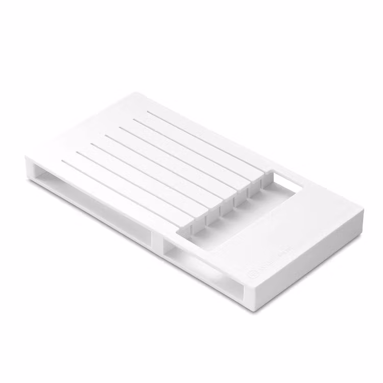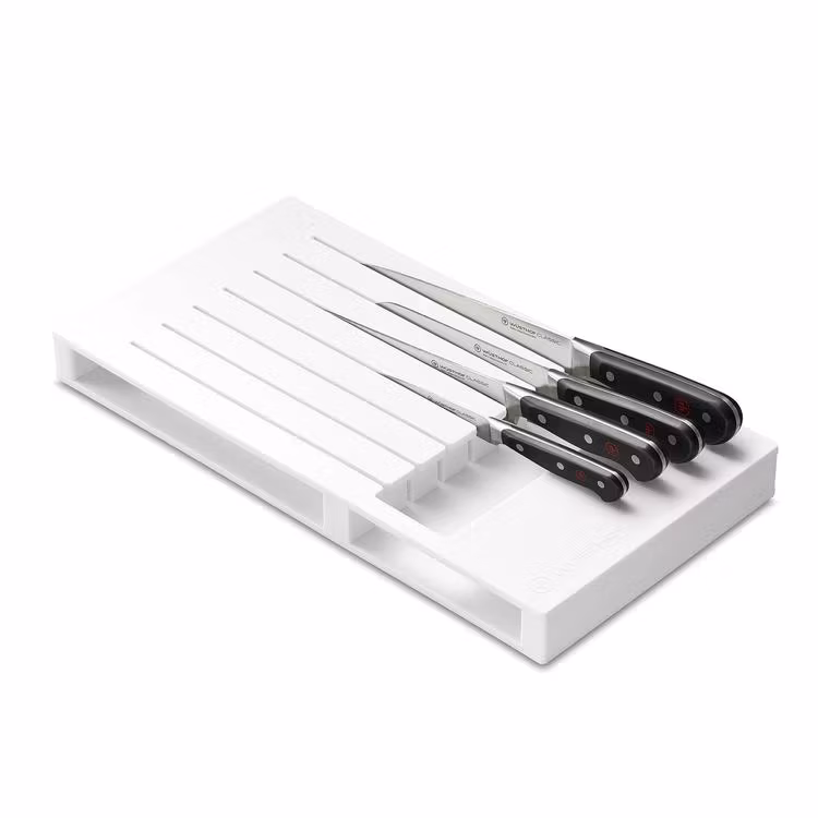 Knivblock för säker förvaring av dina köksknivar i kökslådan. Kapacitet för 7 knivar. Välj mellan två olika färger: Ljust bokträ eller vit plast.