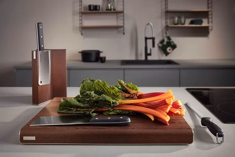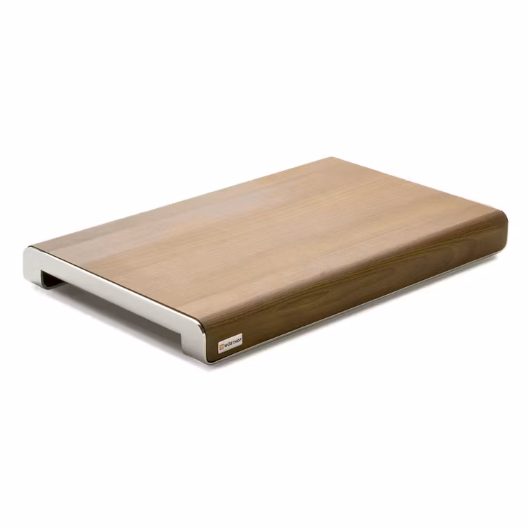 Solid skärbräda i värmebehandlat bokträ med avrundade kanter och metalram. Värmebehandlingen ger träet en mer mörkbrun ton och förändrar träets struktur. Träet blir helt stabilt, slutar att absorbera vatten. Resultatet blir en bakterie-resistent skärbräda som inte kommer att svälla eller krympa. Gummiben förhindrar skärbrädan från att halka på köksbänken.