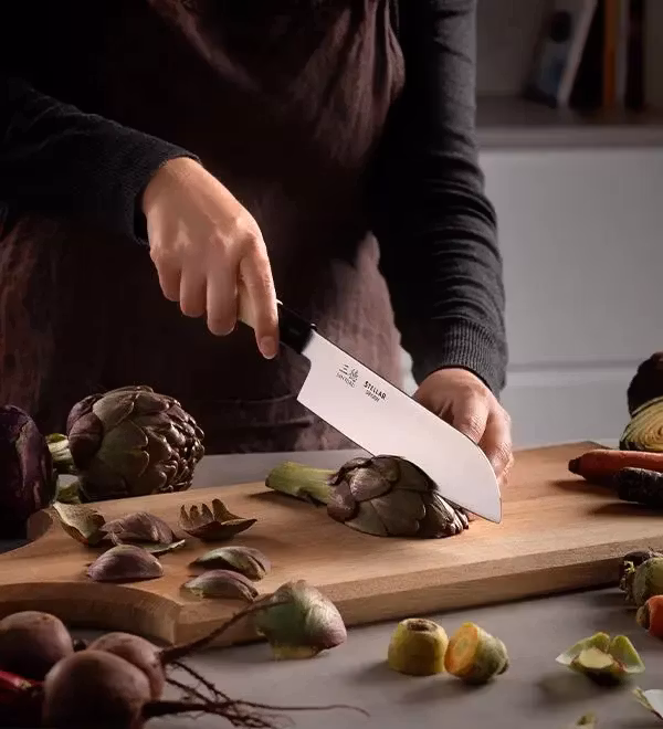 Santoku är en japansk kockkniv som är den vanligaste kniven i de japanska kök och är en kniv med många användingsområden, men speciellt användbar som grönsakskniv. Den raka eggen ger raka och exakta snitt och gör kniven lämplig till att båda skära och hacka med.