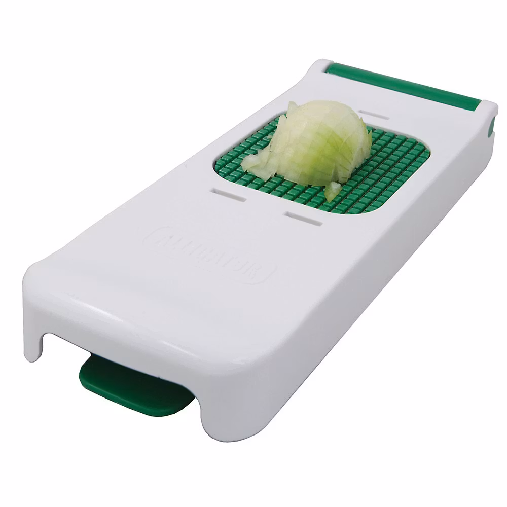 Förenkla vardagen med Alligator Chopper! Alligator Lökskärare utan uppsamlare skär stänger eller tärningar i måtten 6 x 6 mm. Är idealisk för att skära lök, frukt och grönsaker, t.ex. till sallad eller pyttipanna. Tillverkad av ABS-plast och rostfritt stål.