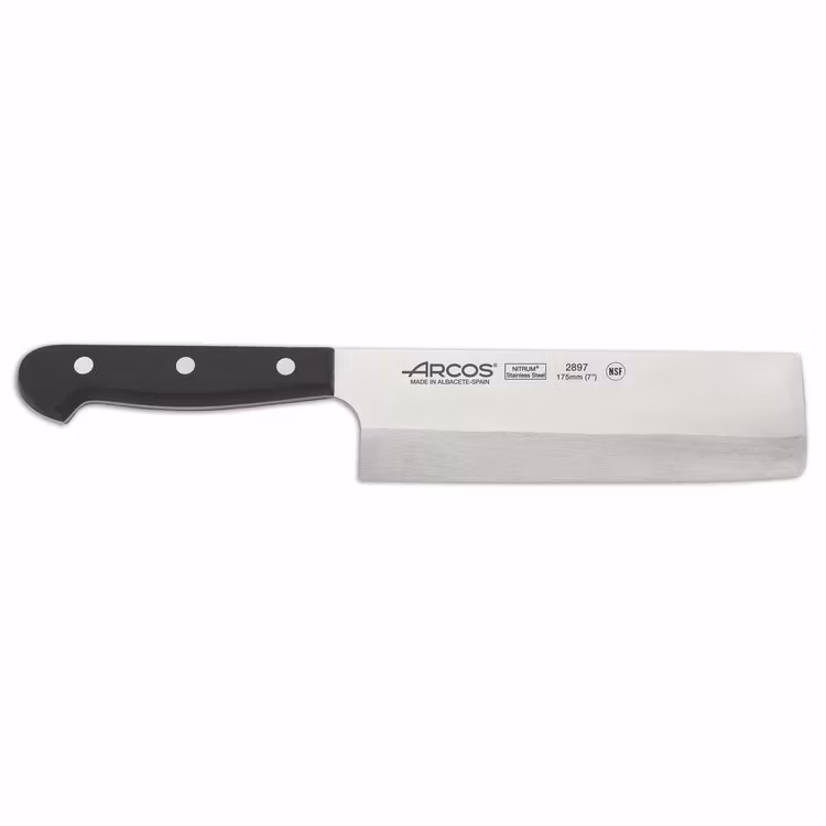 Knivar i Arcos Universal serien är designade med daglig användning i åtanke. Knivarnas blad är tillverkat av Arcos egna NITRIUM®-stål som är en rostfri och härdat formel berikad med kväve för extra hårdhet och långvarig skärpa. Handtagen är gjorda av polyoximetylen (POM) och är mycket motståndskraftig mot slag, förslitning och lösningsmedel och är i stånd att motstå höga och låga temperaturer mellan -40 till 150ºC. Nitarna är tillverkade av rostfritt stål med extremt högt korrosionsmotstånd. Bladet har en såkallad olivslipning, eller culterslipning som det också kallas, som gör att det du skär inte skall fastna på kniven.