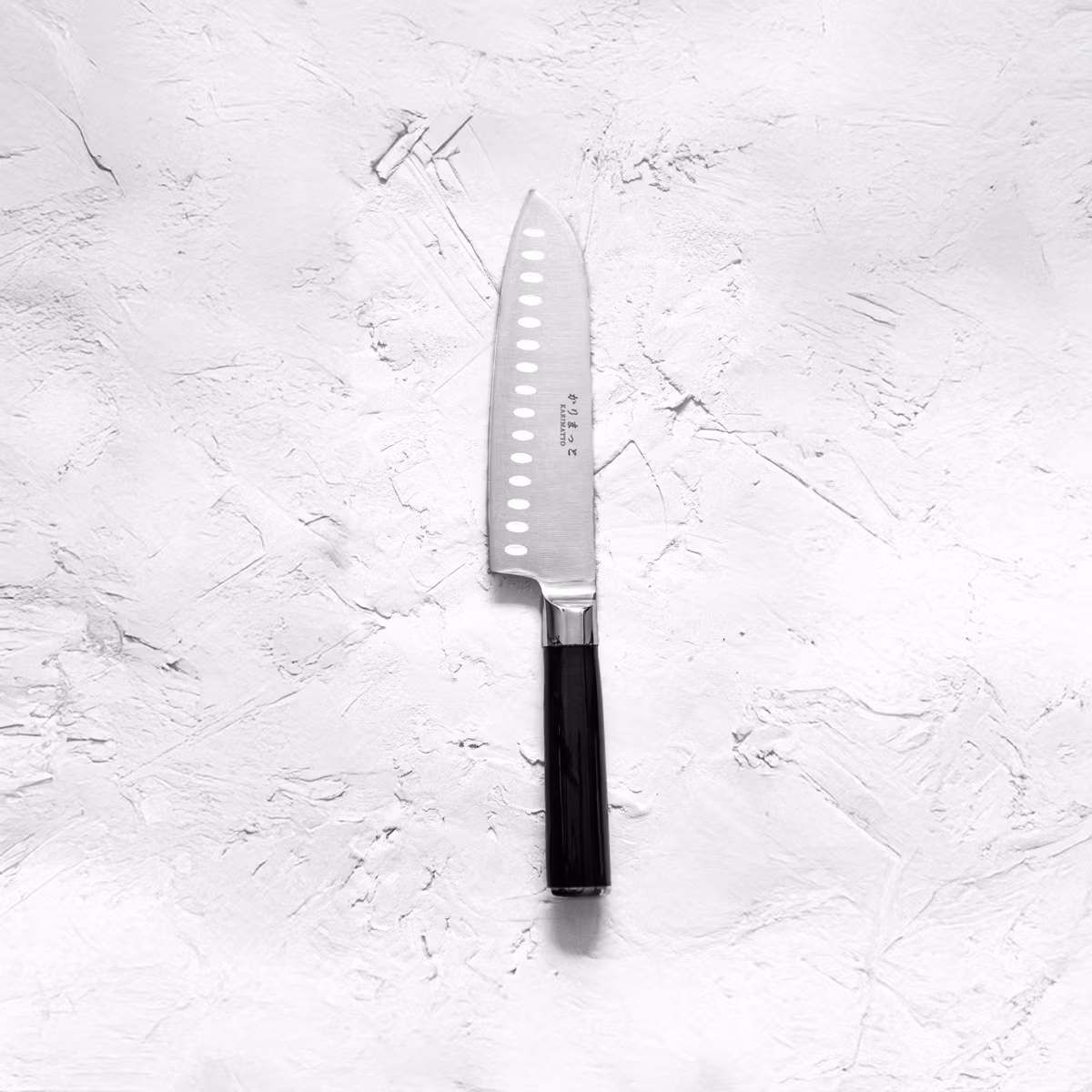 - Santokukniv från Karimatto som passar utmärkt som universalkniv för att skära kött och grönsaker.
