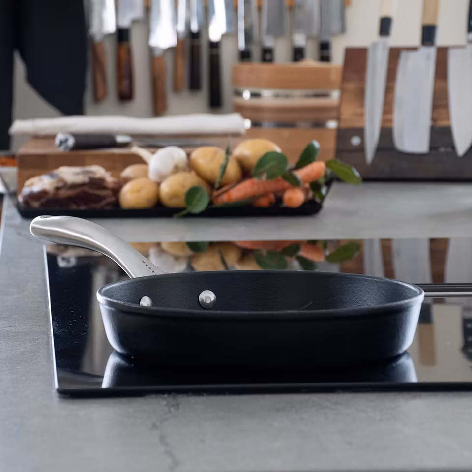 Med ett ergonomiskt handtag i rostfritt stål erbjuder pannan ett stabilt grepp för enklare hantering. Dessutom har den ett extra handtag som ytterligare underlättar hanteringen av pannan. Det rostar inte lika lätt som andra gjutjärnspannor och tål diskmedel, vilket gör rengöringsprocessen till en lek.