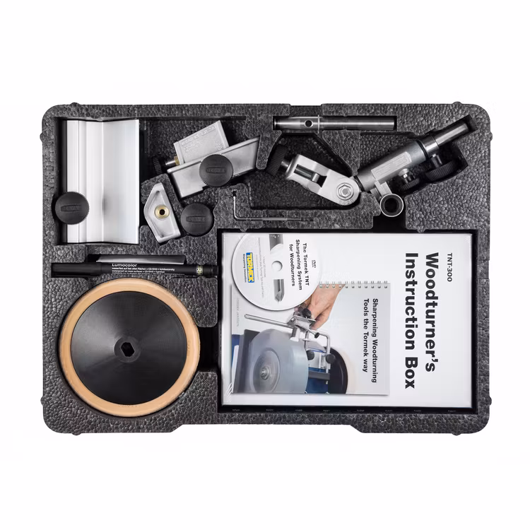 Detta tillbehörspaket innehåller allt du behöver för att slipa och forma dina svarvverktyg, vilket inkluderar två patenterade jiggar (som fungerar som tre!), en profilerad läderbrynskiva, en djupgående instruktion, det uppskattade inställningsdonet för svarvstål, samt Tormek Case för att förvara alla dina jiggar.